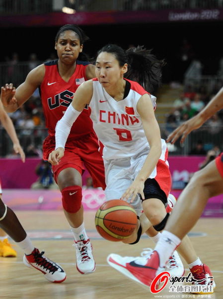 新浪体育讯 北京时间8月5日消息,女子篮球A组预赛开战,中国队66-114惨败于美国队。由此,中国队以小组第3的成绩晋级淘汰赛。图为苗立杰(微博)加油强行突破。