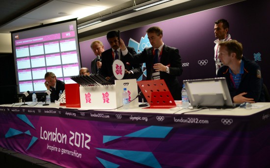 7月23日,伦敦奥运会羽毛球比赛抽签仪式在主新闻中心举行。羽毛球比赛将于7月28日至8月5日在伦敦温布利体育馆举行。